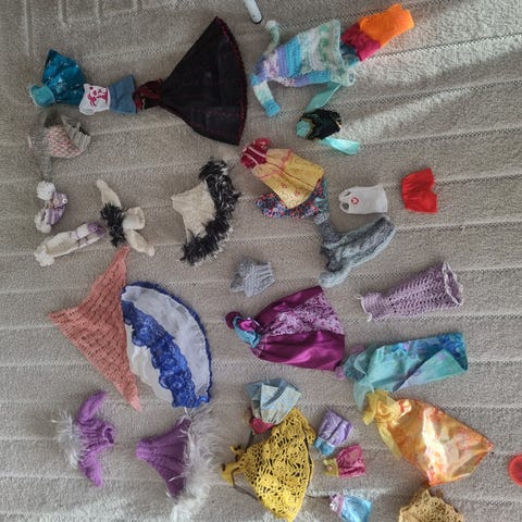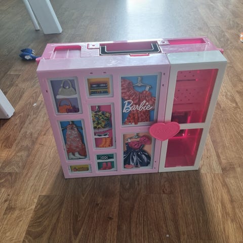 Barbie nukkesetti, johon kuuluu useita Barbie-nukkeja, vaatteita ja asusteita. Kuvissa näkyy muun muassa vaaleanpunainen Barbie-auto kahdella istuimella sekä Barbie-lentokone, jossa on avattava runko, istuimet ja sisätilojen yksityiskohtia. Mukana on myös kaksi merenneito-Barbie-nukkea sekä erilaisia mekkoja ja muita vaatteita. Setti sopii Barbie-nukeilla leikittäväksi ja roolileikkeihin. Kaikki osat ovat muovia ja tekstiiliä, väreinä pääasiassa vaaleanpunainen ja muut kirkkaat sävyt. Tarkka nukkejen ja osien määrä käy ilmi kuvista. Mukana on myös nuken vaatekaappi.