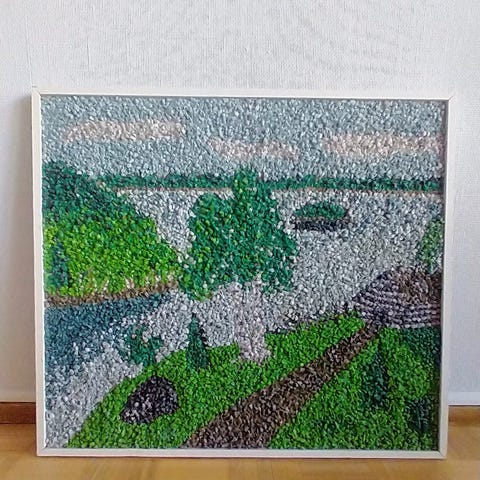 Kaksiosainen pieni maisemataulupari, joissa neliönmuotoiset kuvat luonnonmaisemasta. Molemmissa tauluissa on leveät, kultaiset kehykset ja harmaan sekä sinisen sävyiset kuvat, joissa näkyy muun muassa kasvillisuutta ja vettä. Taulut soveltuvat esimerkiksi seinälle ripustettavaksi vierekkäin tai päällekkäin. Kehysten tarkka materiaali ja taiteilija eivät käy ilmi kuvista.