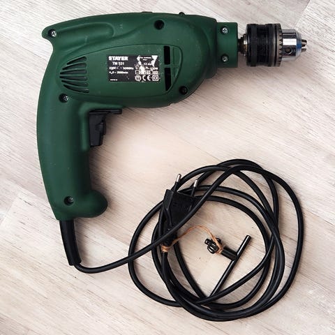 Hitachi Koki johdollinen porakone. Vihreä runko, pistotulpalla varustettu virtajohto. Sopii erilaisten reikien poraamiseen puuhun, metalliin ja muihin materiaaleihin oikeilla terillä. Ja muutama muu porakone minulle ylimäärästä