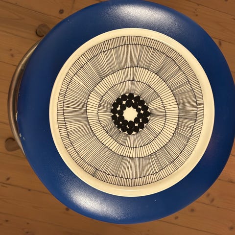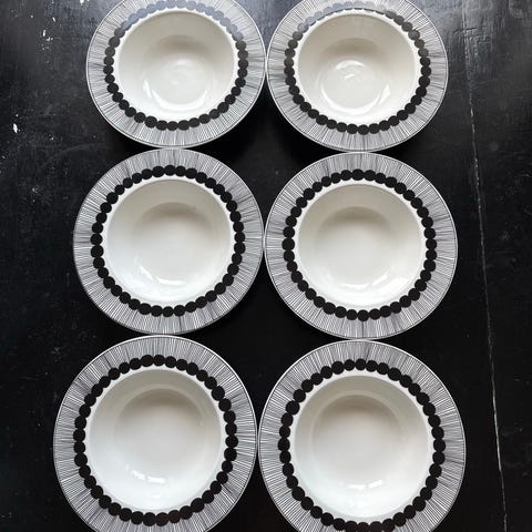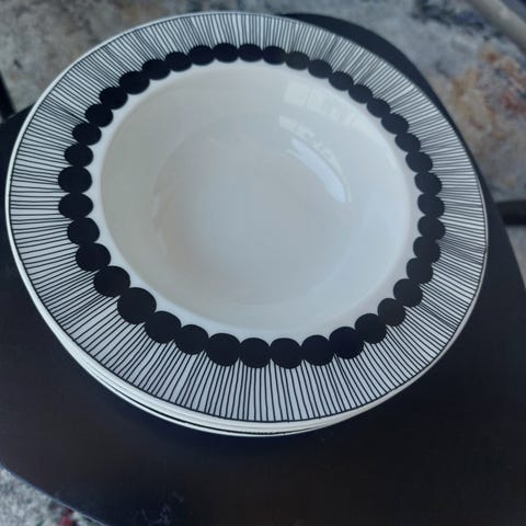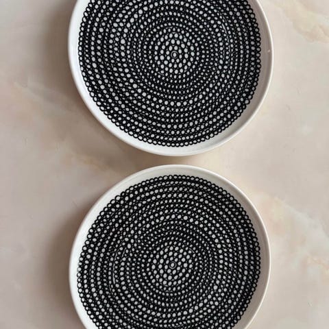 Marimekon Oiva 'Siirtolapuutarha' lautaset mustalla/viininpunaisella kuosilla. Pesty kerran ja muuten käyttämättömät. Pieniä naarmuja kuitenkin havaittavissa, jos taskulampulla tarkasti katsoo. Yritin saada näkyviin kuvissa, mutta ilmeisesti salama ei valaissut tarpeeksi. Säilytetty pinottuna. Myynnissä myös saman sarjan kulhot ja kupit.