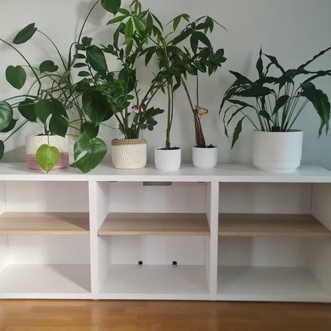 Valkoinen tv-taso, jossa puunväriset jalat ja etureunan yksityiskohdat. Tasossa on kolme alaspäin avautuvaa ovea ja sisällä väliseinillä jaetut säilytyslokerot, jotka soveltuvat esimerkiksi mediulaitteille ja tarvikkeille. Takana on läpivienti johtoja varten. Materiaalina on kalustelevy, pinnassa valkoinen laminaatti tai melamiinipinta. Yhdessä kulmassa on näkyvissä irronnut reunalista, mikä kannattaa huomioida kunnon arvioinnissa.