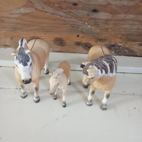 Kuvan vuonohevosperhe kaikki yhteensä 80 €. Hepat löytyvät Itä-Vantaalta Päiväkummusta.