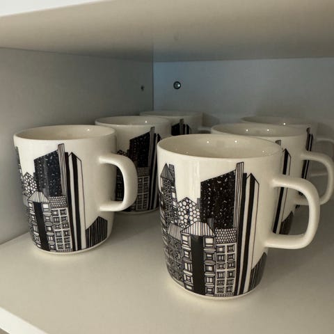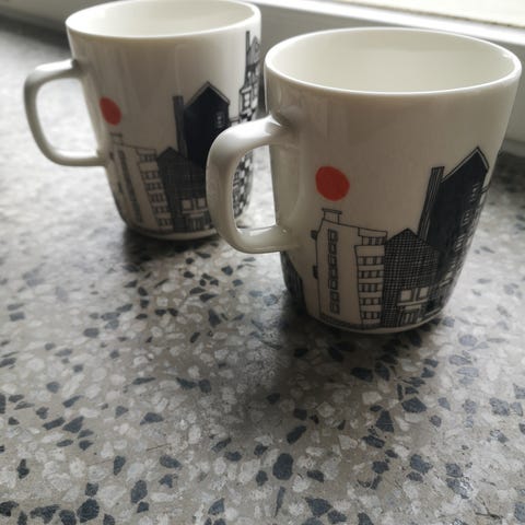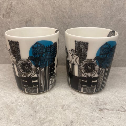 Marimekon Oiva 'Siirtolapuutarha' mukit mustalla/viininpunaisella kuosilla. Pesty kerran ja muuten käyttämättömät. Säilytetty pinottuna. Myynissä myös saman sarjan lautaset ja kulhot.
