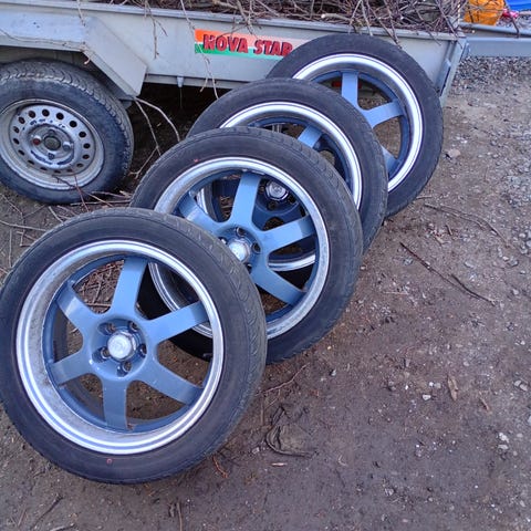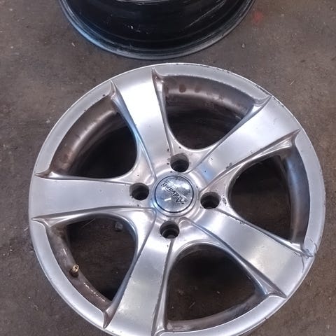 Alumiinivanteet, 4 kappaletta, 3 kpl vanteista samalla ulkonäöllä ja yksi hiukan erilainen ulkonäkö. Väri hopea/metallinhohto.