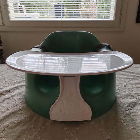 Bumbo vaaleanharmaa vauvanistuin/taaperonistuin. Aiemmalla omistajalla värjäytynyt varmaan soseista ja vyöt poistettu. Vöiden kiinnitykset vielä paikoillaan. Eläimetön ja savuton koti.