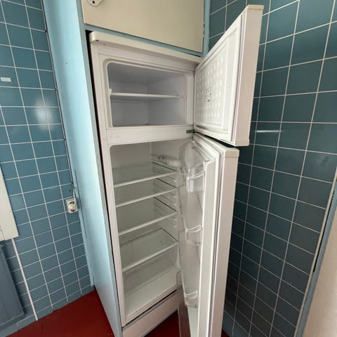 Miele jääkaappipakastin, Yläosassa jääkaappi useilla säädettävillä lasihyllyillä ja vihanneslaatikoilla, oviin integroidut hyllyt pienemmille tuotteille. Alhaalla erillinen pakastinosa omalla ovella. Mekaaninen lämpötilansäätö sisäpuolella. KxLxS 180x55x60cm.