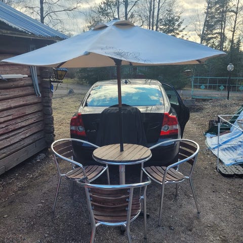 Muovinen puutarhakalustesetti, johon kuuluu suorakulmainen pöytä ja kuusi käsinojallista tuolia. Kalusteet ovat vihreää muovia ja soveltuvat ulkokäyttöön esimerkiksi terassille tai pihalle. Pöydän keskellä on reikä aurinkovarjolle. Tuolit ovat pinottavia, mikä helpottaa säilytystä. Yhden tuolin jalan alaosassa pieni lohkeama ja näkyy käytön jälkiä. Ollut talvisäilytyksessä vaatii pesun. Tule ja nouda 30€. Ei varauksia.