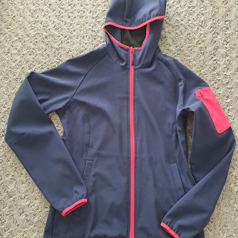 Käytetty, mutta täysin vielä toimiva kuoritakki. Paljon heijastimia ja vetoketjutaskuja. Kyljissä vetoketjulliset tuuletusaukot. Alahelmasta vähän liimaus pettynyt ja kiristysnauha irti (kuva)