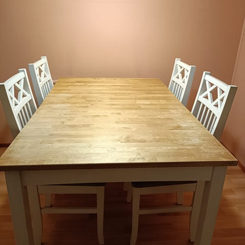 Pöytä ja kuvasta poiketen 6 tuolia.