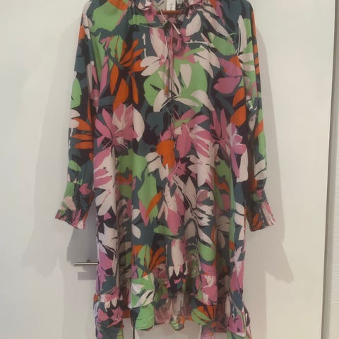 Ihana graaffinen kuosi, rento malli, sopii monenkokoiselle, hihansuissa ja edessä pienet röyhelökoristert, edessä myös napit n. Rinnan alle, frillahelma.