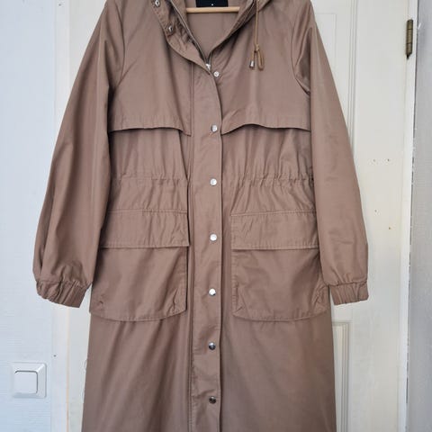 Nanso pitkä takki naisille. Koko S. Väri beige. Materiaali polyesteriä, tikattu pinta. Edessä painonappikiinnitys ja suuret etutaskut. Hihansuissa joustavat resorit ja helmassa pienet halkiot sivuilla. Sopii arkeen ja ulkoiluun viileämpiin säihin.