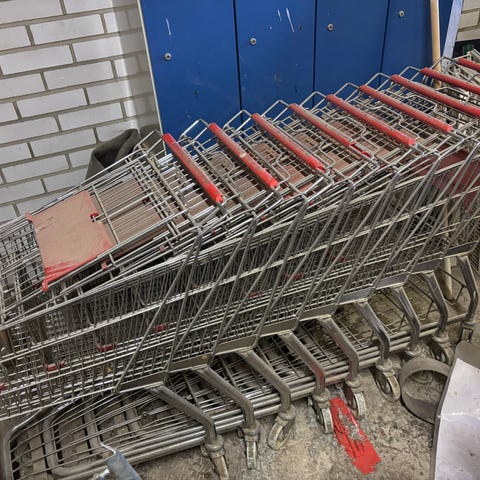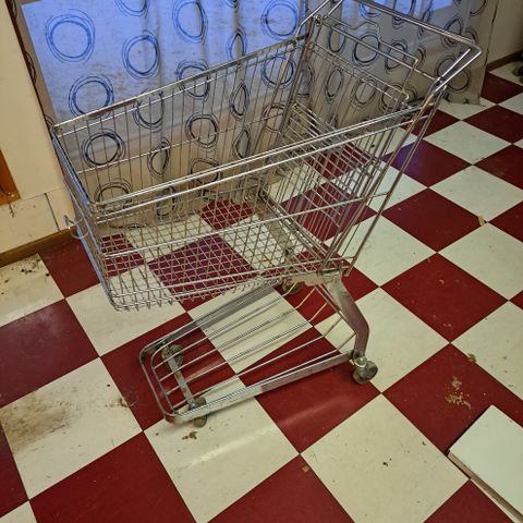 Metallinen ostoskori, jossa on siniset muoviset kahva- ja kulmasuojat. Kori on varustettu neljällä kääntyvällä pyörällä, mikä helpottaa liikuttelua. Soveltuu esimerkiksi tavaroiden kuljettamiseen pihalla, varastossa tai muussa tilassa, jossa tarvitaan liikuteltavaa koria. Rakenne on avonainen ritilämetallia, ja korissa on työntökahva sekä lapsenistuimelle varattu tila.