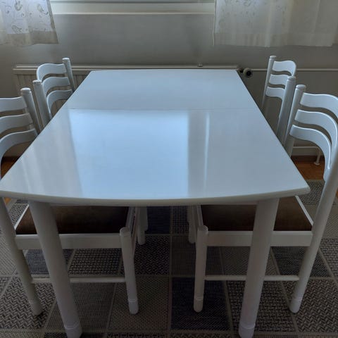 Siistikuntoinen keittiön pöytä ja kolme tuolia ylimääräisenä. Pölyttyy varastossa. Pöytä on purettu valmiiksi. Pöydässä pieniä käytön jälkiä mutta muutoin siisti ja maalipinta on hyvä. Pöytää on mahdollista jatkaa eli saada pidemmäksi mutta kolmas kansi pala puuttuu. Tuolit siistit, päälyset on edellinen omistaja päällystänyt mustalla kankaalla suht siististi.