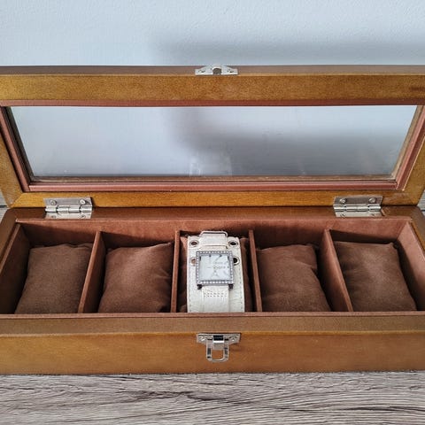 Kuvanmukainen 3 kellon puinen kellolaatikko. Sisällä on pehmustetut lokerot, kellojen säilytykseen. Kunto erinomainen. Ovh 98.00€.