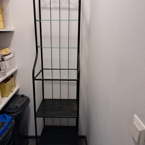 Hyväkuntoinen valkoinen metallihyllykkö, kolme keskimmäistä hyllyä lasia.
