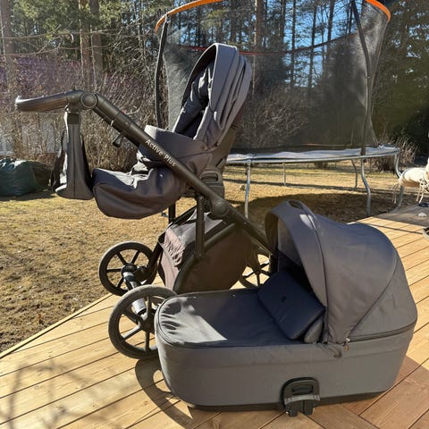 Suuret renkaat ja kääntyvät sekä lukittavat eturenkaat helpottavat työntämistä erilaisilla alustoilla. Rattaissa on tilava tavarakori alla.