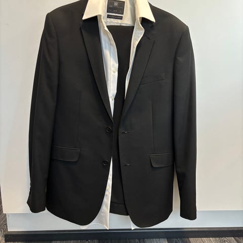 Hyvä puku seuraavalle. 160 cm puvuntakki, housut 28/30. On ollut noin 12 vuotiaan päällä juhlissa.