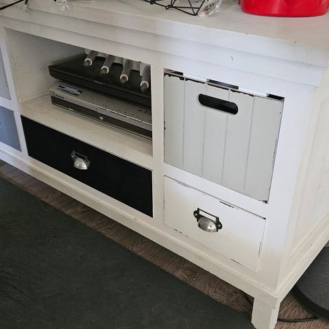 Yläkerran telkkarin tasona muutaman vuoden ollut laadukas taso. Ostettu huonekaluliikkeestä.