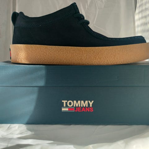 Tommy Hilfiger tennarit, koko 43. Väri musta. Kuvissa näkyy tarkemmat tiedot kengön koosta. Kulumaa lähinnä kohdassa mistä kenkä laitetaan jalkaan. Muuten siistit ja ehjät, etenkin jos viitsii vähän putsata.