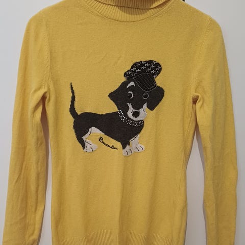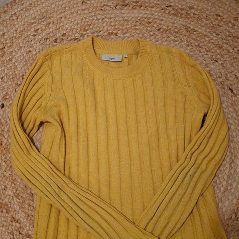Yllättävän laadukas, ei juuri nukkaantuva, ihanan vaaleankeltainen villapaita. Koko S / 36, vastaa kokoaan. Kunto hyvä, vain pientä pinttymää hihansuissa, joka ei minusta häiritse käytössä. Juuri pesty villapesuohjelmalla.