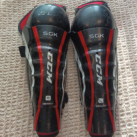 CCM U+ Fit05 jääkiekkosäärisuojat, pituus 30 cm (12”). Väri valkoinen sinisillä ja mustilla yksityiskohdilla. Säärisuojissa on moniosainen rakenne, pehmustetut sivu- ja polvisuojat sekä säädettävät remmit kiinnitystä varten. Soveltuvat jääkiekkoon ja muuhun jäällä pelattavaan lajiin, tarjoavat suojaa sääriin ja polviin.