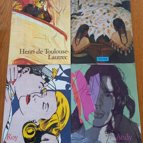 Kuusi suomenkielistä ja yksi ruotsinkielinen taidekirja. Kimppadiilinä yhteensä 10€. Erikseen ostettuna isot A4-kokoiset kirjat 2€/kpl, pienet 1€/kpl.