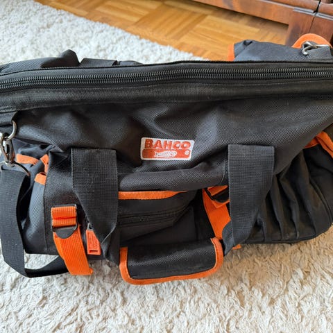 Bahco työkalulaukku musta/oranssi. Vetoketjulla suljettava pehmeä laukku, jossa useita kiinnityslenkkejä ja taskuja työkaluille sisäpuolella. Sopii käsityökalujen ja pienten tarvikkeiden säilytykseen ja kuljettamiseen.
