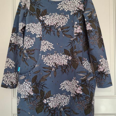 Nupun Sydäntalvi-trikoosta ommeltu mekko. Kankaaseen on pesuissa tullut vaaleaa nukkaa. Muuten hyvässä kunnossa. Hihat 3/4-mittaiset ja helmassa kuminauha. Rinnanympärys 90, pituus olalta helmaan 86 cm ja hihan pituus 45 cm.