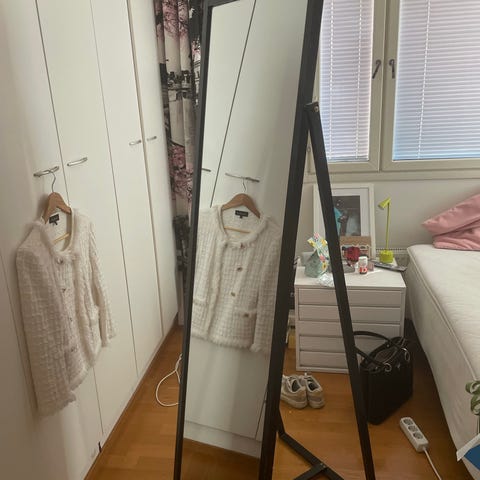 Puinen kokovartalopeili, jossa on luonnonvärinen puukehys. Peili on suorakaiteen muotoinen ja sopii esimerkiksi eteiseen, makuuhuoneeseen tai vaatehuoneeseen. Peili voidaan asettaa nojaamaan seinää vasten tai kiinnittää seinään kiinnitystapojen mukaan. Koko 48 x 100 cm. Hinta kiinteä, vain nouto ja käteismaksu.