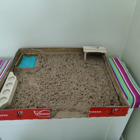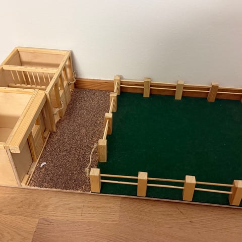 Myydään itse tehty ratsastuskenttä schleich leikkeihin, jämäkkä rakenne joten kestää leikkejä ja nostamista. Kiinteä hiekkakenttä eli hiekka on alustaan liimattu, joten voi huoletta leikkiä ☺️