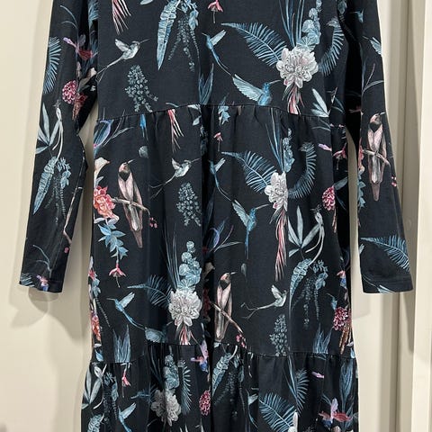 Nakoan midimittainen mekko, puuvillatrikoota kolibri- kuosilla. Käytetty paristi, ei ole tarvetta ollut pestä. Kunto erittäin hyvä.