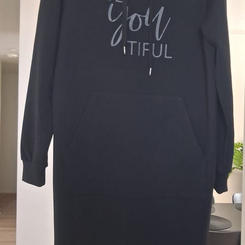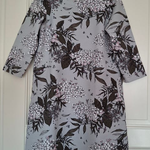 Nupun Syysmuutto-joustocollegesta ommeltu mekko. Edessä leikkaussaumoihin upotetut takut, takana selässä kaksi pystysuuntaista muotolaskosta. Mekko on vartalonmyötäinen. Rinnanympärys 88 cm, pituus olalta helmaan 83 cm ja hihanpituus 58 cm.