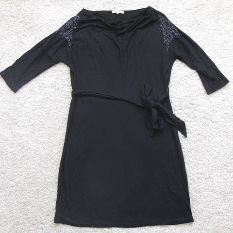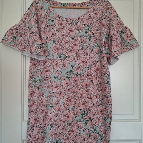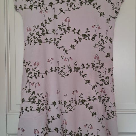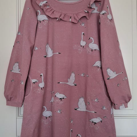 Nupun Syysmuutto-trikoosta ommeltu mekko. Edessä rintamuotolaskokset, sivuilla taskut, helmassa kuminauha. Rinnanympärys 92 cm, pituus olalta helmaan 92 cm ja hihanpituus 48 cm.