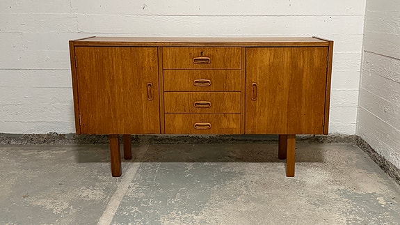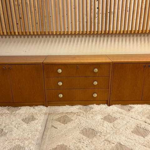 Upea pitkä ja matala senkki. Täydellinen myös tv-tasoksi. Kaunista tammea. (Tai pyökkiä?) Pinnat juuri öljytty. Laatikot sisältä siistit ja liukuvat hyvin. Raikas ei hajuja.