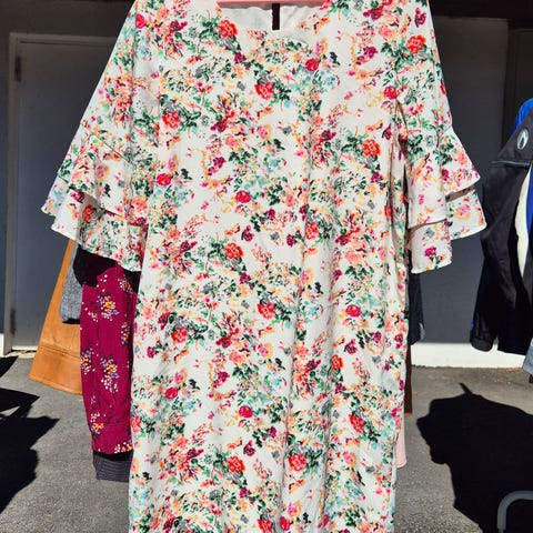 M-koko. 100% viskoosia, kainalo-kainalo 53, olka-helma 86. Hihoja voi kääntää ja kiinnittää nappiin. Kerran käytetty, kerran pesty. Kunto prima.