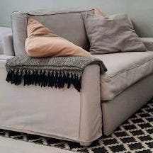 Ikean vuodesohva: aika vanha malli kyseessä, kangas on jonkin verran kulunut istuinosasta ja väri haalistunut varsinkin selkänojasta (varmaan myös auringon takia). Kuitenkin ihan käyttökelpoinen, saa avattua kivasti pidemmäksi, kaksi eri vaihtoehtoa sille, kuinka pitkäksi haluaa.