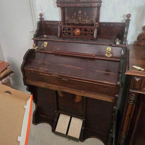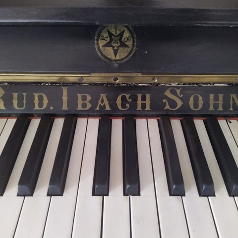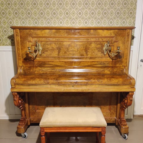 Musta vanhan pianon etulevy, messinkisillä koristeellisilla kyntteliköillä
