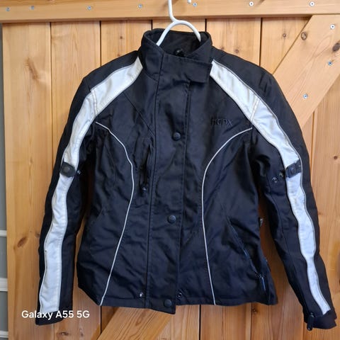 Hanx moottoripyöräasu, johon kuuluu ajotakki ja ajohousut. Takki on musta–punainen, harmailla yksityiskohdilla, koko XL. Takissa on vetoketjullinen etutasku, säädettävät hihat. Sisäpuolella on verkkovuori ja selkäpanssari tai selkäsuoja. Housut ovat mustat, polvissa vahvistetut ja muotoillut alueet. Ajovarusteet soveltuvat moottoripyöräkäyttöön ja tarjoavat suojaa ajossa. Koko ja malli sopivat aikuiselle käyttäjälle.