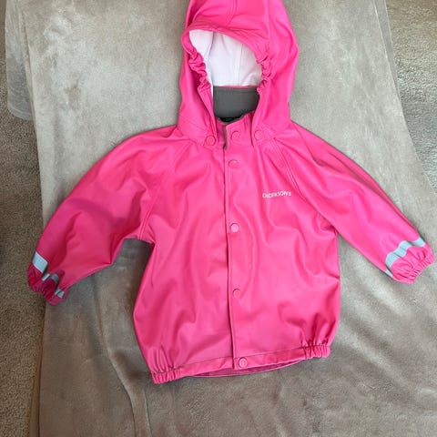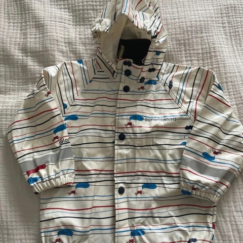 Didriksons sadetakki oranssi-turkoosi koko 90 (mielestäni reilu). Materiaali polyuretaani. Muuten hyvä kunto, mutta pinttynyttä likaa (kuva).