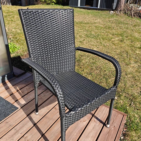 Muovinen sininen taitettava ulkotuoli käsinojilla. Tuolissa on korkea selkänoja pystysuuntaisilla rimoilla ja istuinkorkeus sopii parvekkeelle tai terassille. Materiaali on säänkestävää muovia, ja tuoli on taitettava säilytyksen helpottamiseksi.