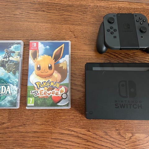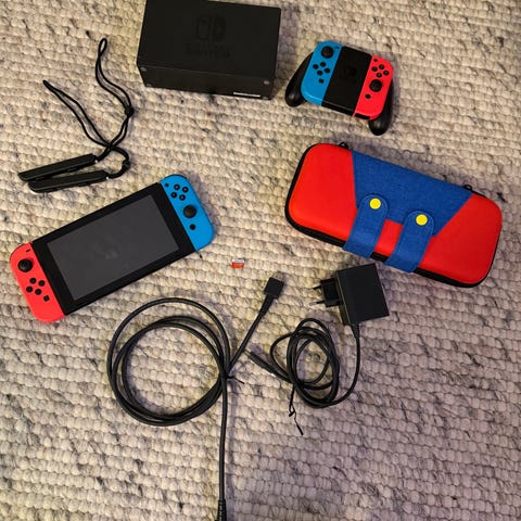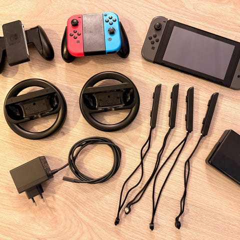 Nintendo Switch pelikonsoli harmaa. Mukana kannettava konsoliosa, telakka, harmaat irrotettavat Joy-Con-ohjaimet, Joy-Con -rungot, Pro-tyylinen ohjain, virtalähde ja kaapeleita. Kuvissa näkyy myös kantokotelo sekä useita Nintendo Switch -pelikasetteja. Konsolia voi käyttää sekä telakoituna televisioon liitettynä että käsikonsolina. Soveltuu usean pelaajan peleihin irrotettavien ohjainten ansiosta.