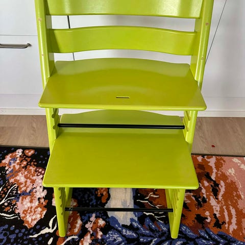Stokke Tripp Trapp syöttötuoli, valkoinen. Tuolissa on säädettävä istuin- ja jalkataso, jotka voidaan asettaa eri korkeuksille lapsen koon mukaan. Kulumajälkiä ja naarmuja rungossa ja tasoissa. Mukana irrotettavat pehmusteet, joissa punavalkoinen raitakuosi, sekä irrallinen vyöosa. Soveltuu lapselle, joka osaa istua itse. Tuoli on suunniteltu käytettäväksi ruokapöydän ääressä tai muuna istuimena lapselle. Nouto viimeistään 17.5