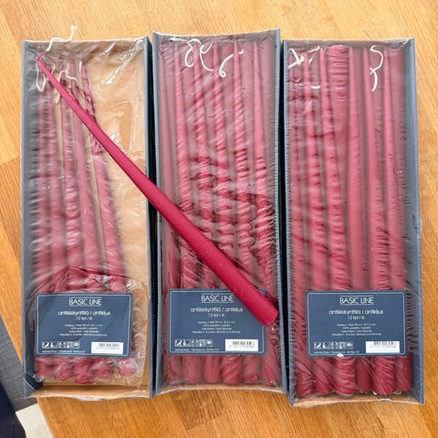 38cm pitkiä antiikkikynttilöitä, väri lämmin punainen. Pakkausta avattu vain että sain kynttilät kuvaan