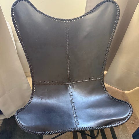 Vanha musta lepakkotuoli uudemmalla harmaalla kankaalla. Runko on kiinteästi hitsattu kokoon, ei siis mene paloiksi, kuten uudemmat versiot. Maalissa lohkeamia. Maksimileveys 73 cm, max.korkeus 80 cm. Nouto Itä-Pasilasta.