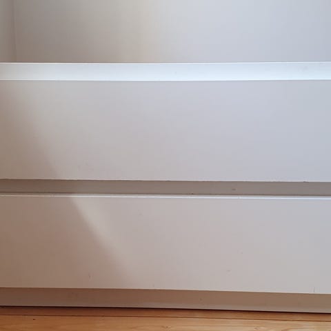 Pöytälevyssä pintanaarmuja ja laatikoiden reunoissa maalipinnan kulumaa.