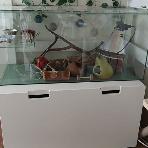 Siisti 5 v vanha terraario 70 x 40 x 60 cm ( leveys x syv x kork.). Yläosassa kiinteänä kaarna + oksaa, ollut käärmeellä. Tarkempi siivous jää ostajalle. Lisäksi voi ostaa todella vähän käytetyn lämpömaton 5 eurolla. Nouto Keravalta.