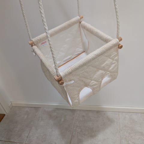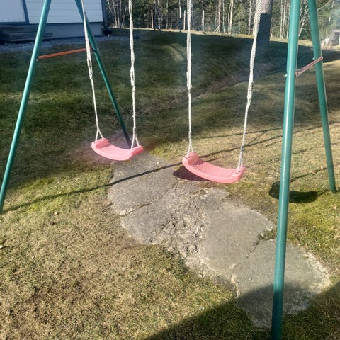 Kuvan pihakeinu. Kaksi tasaista keinua, yksi vauvakeinu ja yksi molemminpuolinen istuttava keinu.