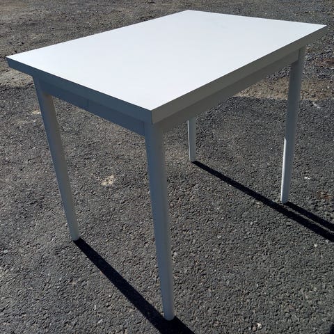 Neliönmuotoinen ruokapöytä pieneen kotiin. Ostettu aikanaan Askosta tai Sotkasta. Kannessa pieniä jälkiä, kaikissa jaloissa isompia. Kulmissa myös jälkeä. Pöytälevyn paksuus 18 cm, jalat 5.4 x 5.4 cm.