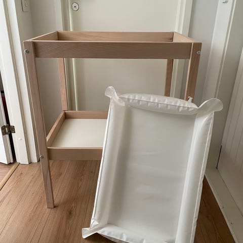 Hyväkuntoinen Ikean Sniglar-hoitopöytä, johon sopiva Jyskin vaipanvaihtoalusta ja kaksi siihen sopivaa Ikean Skötsam-suojusta. Kaikki hyvässä kunnossa. Suojukset pesty hajusteettomasti.