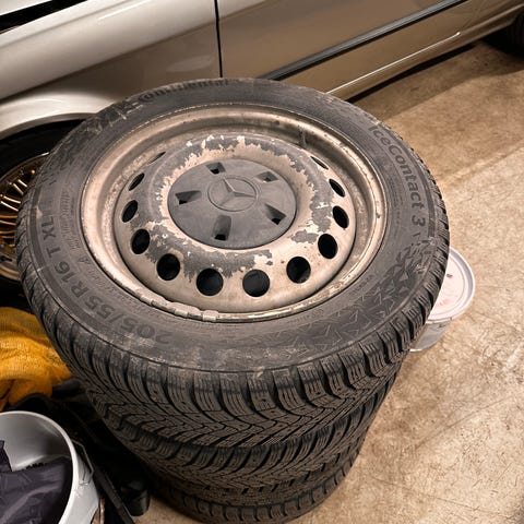 MB Viton peltivanteet nastarenkailla. Ei enää talvirenkaiksi, mutta nastat poistamalla voi ajaa pari kesää.